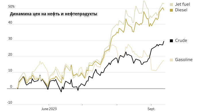 Больше всего подорожало авиационное топливо: с начала мая стоимость на побережье Мексиканского залива выросла более чем на 50%. По данным аналитической компании Kayrros, спрос в Китае резко увеличился, поскольку Пекин ослабил ограничения на поездки, введенные во время пандемии, из-за чего потребление авиатоплива в августе вернулось к докоронавирусному уровню, хотя год назад оно было на 60% ниже.