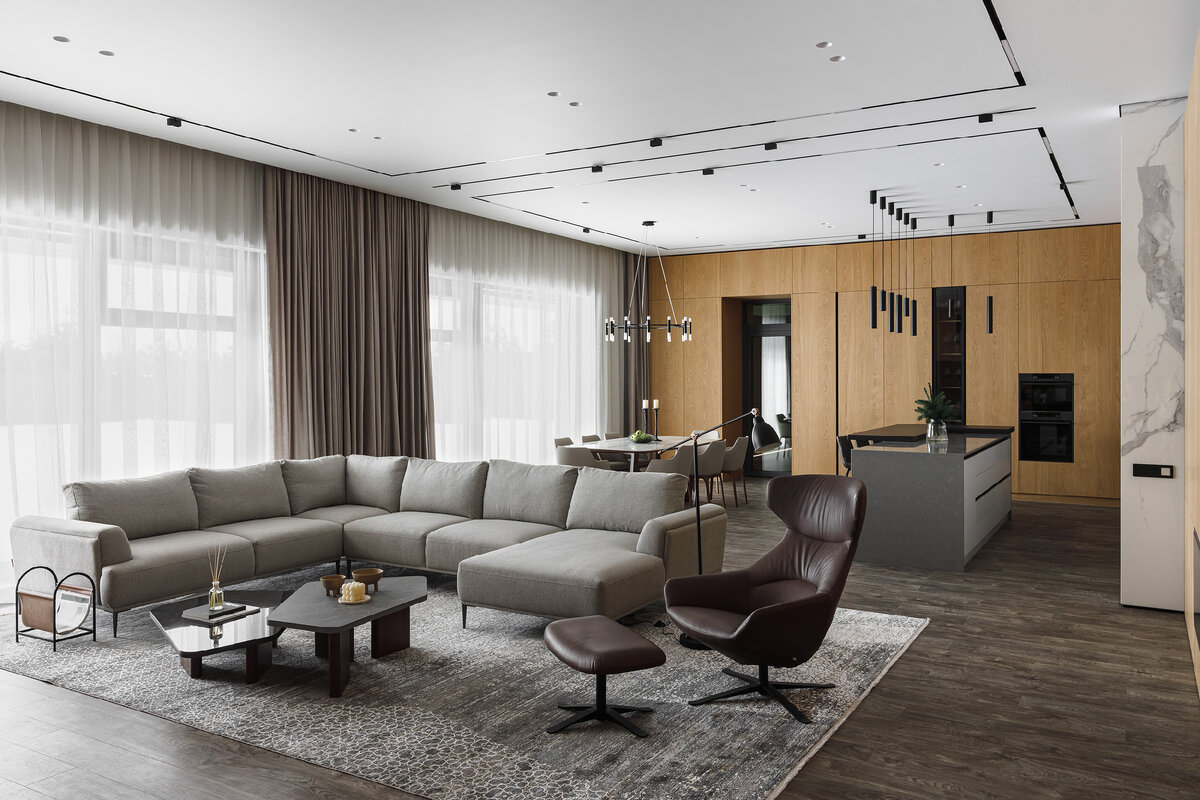 Два года назад студия дизайна интерьеров ALI_ARCHITECT_ приступила к разработке интерьера одноэтажного жилого дома в коттеджном поселке Corner Bright с плоской кровлей и внушительными габаритами — около 400 кв. м. Заказчик настаивал на определенной планировке и стремился к минимальной загруженности пространства и максимальным функциональности и комфорту. Интерьер получился сдержанным и лаконичным, но при этом уютным. Основное помещение в доме — кухня-гостиная площадью 90 кв. м. Это цельное и гармоничное пространство с разными функциональными зонами — просторной кухней с островом, столовой и гостиной с биокамином. Натуральные материалы, такие как дерево, стекло, кожа и камень, привносят в интерьер динамику, помогают произвести эффектное впечатление, а тактильные поверхности не дают ему выглядеть уныло, однообразно и «плоско». В основных помещениях на стенах использована декоративная штукатурка в сочетании со шпонированными стеновыми панелями, в комнатах отдано предпочтение покраске с б