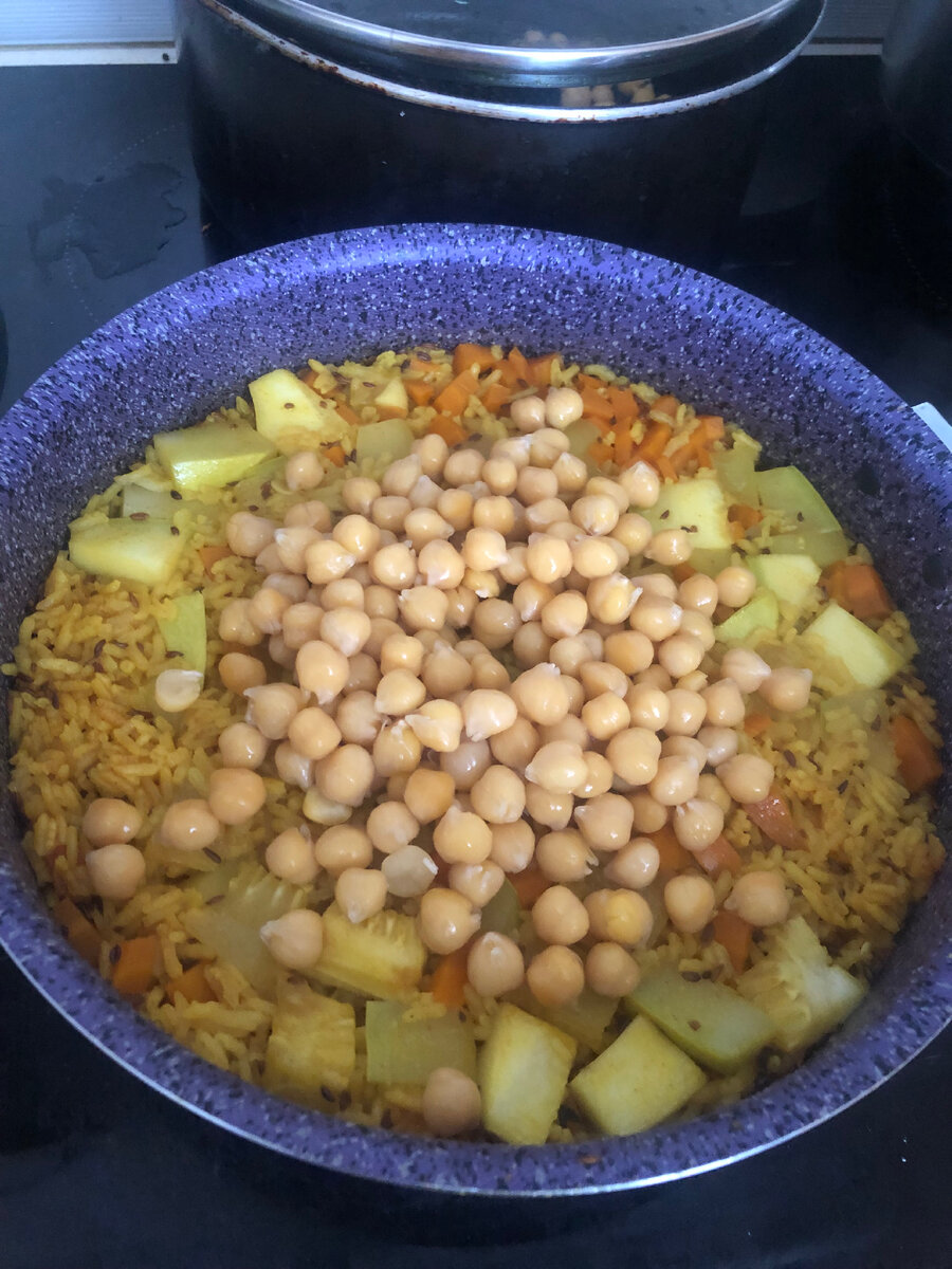 Сытное, простое, белковое блюдо 🍲 Готовиться как плов. Это рис с нутом 😋 Замочить с ночи нут. Утром промыть, поставить варить на 45 -60 мин; Рис промыть, и оставить в воду, в это время нарезать морковку и на скороходе обжарить. Перед этим масло налить и растопить специи (куркума, зира) потом добавляю морковку. Чуть поджаря её насыпаю рис 🍚 и его прожариваю немного. Потом заливаю водой 1 рис/ 2 воды Добавляя туда кабачок порезанный кубиками. Оставляю под закрытой крышкой на 16 минут. После готовности добавляю нут и перемешиваю. Сверху можно посыпать заленью 😇