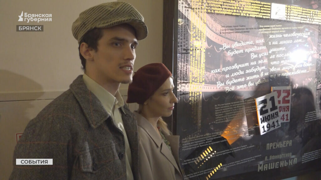 Проект Брянского театра драмы имени А.К. Толстого «Чтобы помнили…», посвященный 80-й годовщине освобождения Брянщины от немецко-фашистских захватчиков, адресован прежде всего молодому поколению. Необычное действо, происходившее в фойе театра, словно машина времени перенесло собравшихся в далекий июнь 1941 года. Брянский городской драмтеатр тогда имени Маяковского был на гастролях в Белоруссии. 70 человек: актеры, режиссер, администрация, работники сцены. На сцене Гродненского театра они играли премьеру, спектакль «Машенька». Это был последний спектакль брянской труппы. Школьникам, которых пригласили в драмтеатр, рассказали о прерванных гастролях в далеком 1941 году. Показали инсталляцию, под стеклом которой запечатаны фамилии всех, кто не вернулся после войны домой. Из семидесяти членов коллектива только 11 смогли добраться до Брянска. Одни оказались на оккупированной территории и прошли концлагерь под Минском. Четверо — художественный руководитель Волин, заведующий музыкальной частью