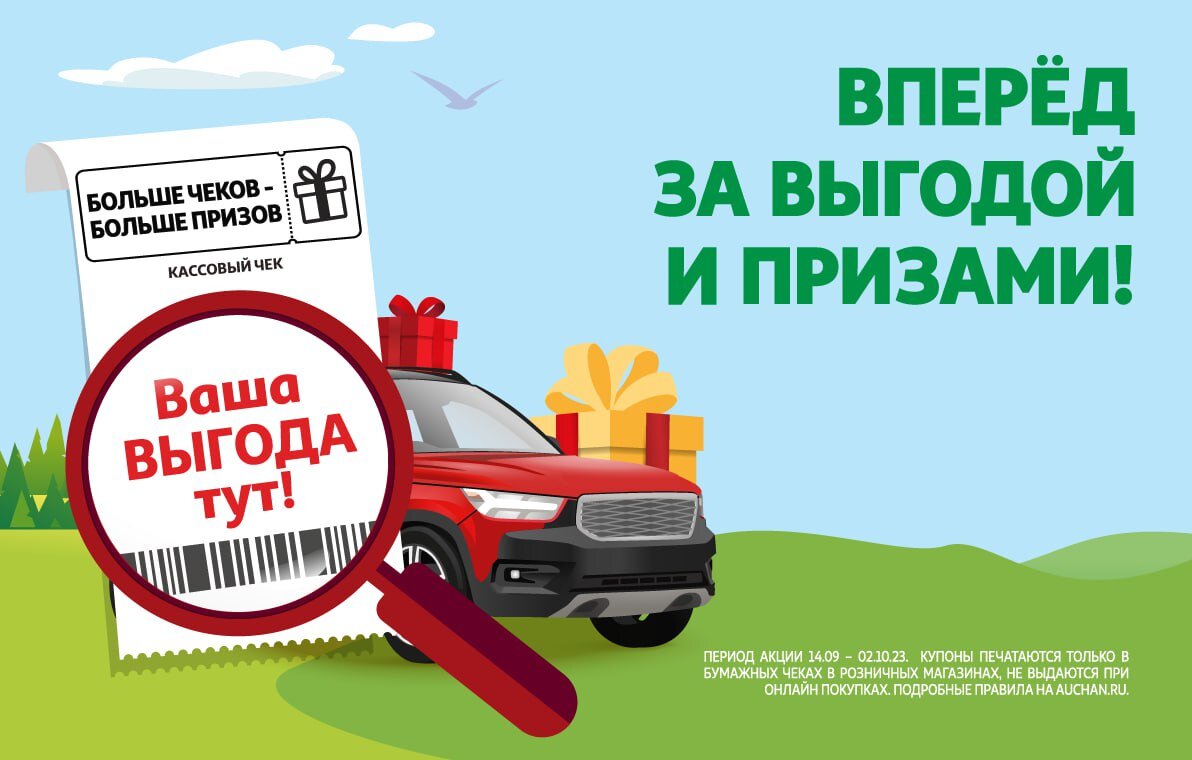 erid: Kra23ycKZ Осень – не время грустить! Осень – время принимать участие в нашем новом ВАУ-розыгрыше, где главный приз – а-а-автомоби-и-иль! Призы ждут каждого – купоны на скидку, подарки от партнеров и даже путешествие по России! Скорее читайте правила и принимайте участие! Розыгрыш проводится с 14 сентября по 2 октября 2023 года. Совершайте покупки с картой лояльности: · в гипермаркетах АШАН и АШАН сити – от 2000 рублей; · в супермаркетах АШАН – от 1000 рублей. Получайте купон со скидкой на следующую покупку, а главное – шанс выиграть автомобиль и дополнительные призы от партнеров!