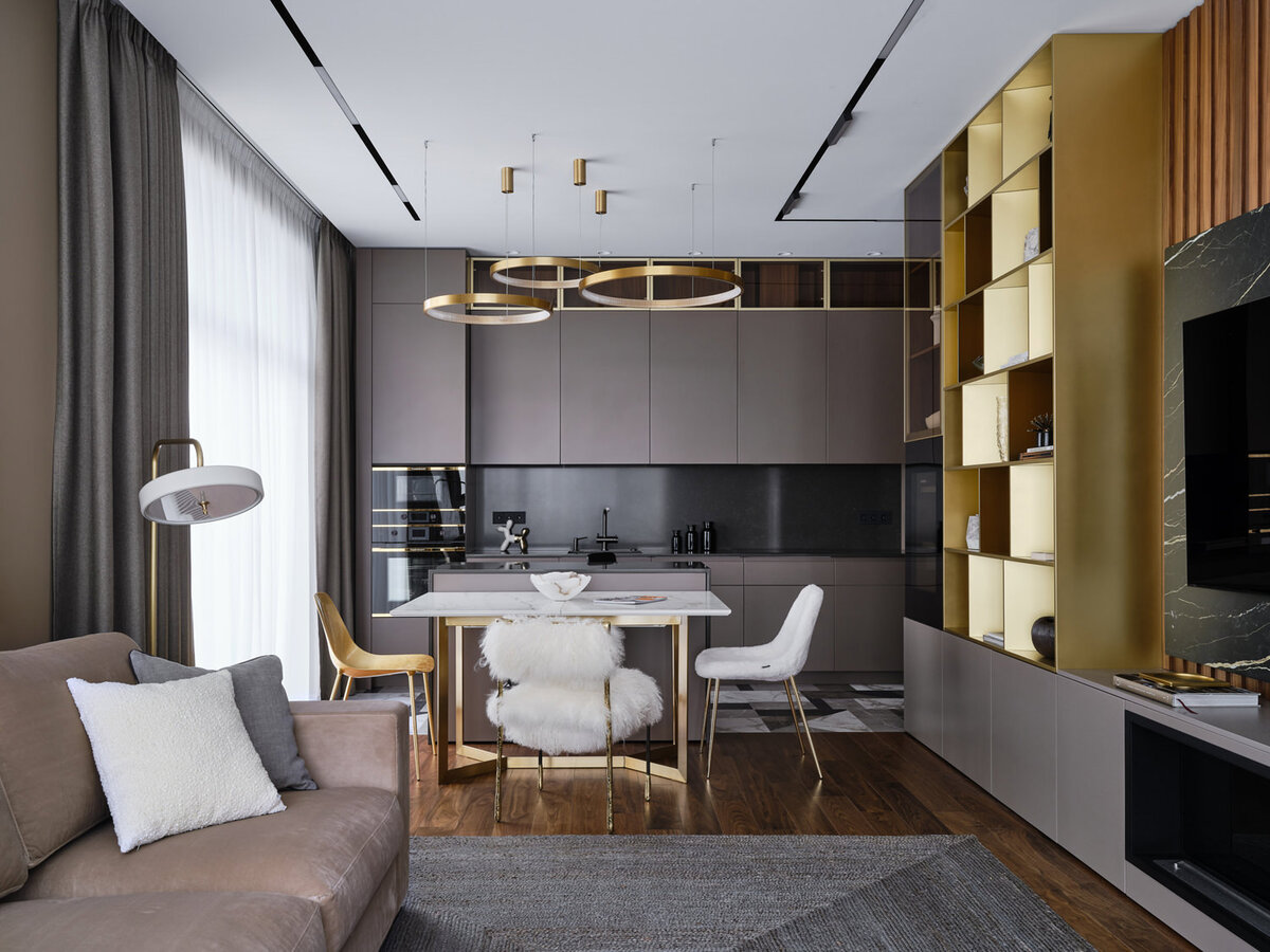 Общее пространство кухни-гостиной выкрашено в сложный оттенок серо-коричневого. Причем в этот цвет выкрашены как стены, так и кухонные фасады. На полу —инженерная доска в тонах американского ореха, текстиль — более светлых тонов. А сообщать роскошь и парадность «поручили» светильнику над обеденным столом и стеллажу из желтого металла «под золото».