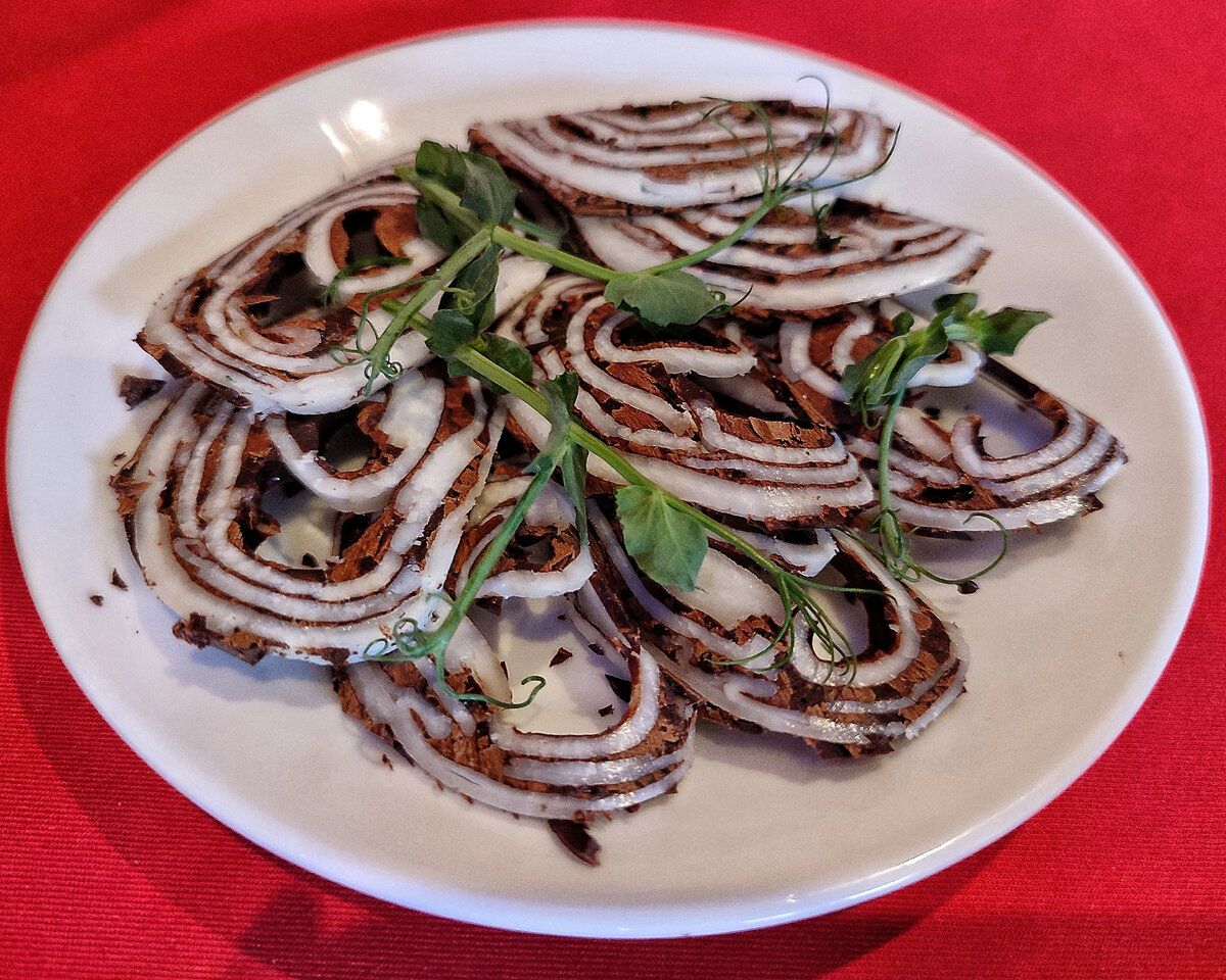 И вот принесли нам это блюдо. Всего 50г, но тончайшая нарезка рулетика из тончайших слоёв. На фото - оно самое, как же не сфоткать?!