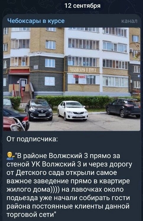 В Чебоксарах в районе Волжский, прямо за стеной УК Волжский 3 и через дорогу от Детского сада, недавно открылось самое важное заведение – магазин, специализирующийся на табачных и алкогольных изделиях. Это стало настоящей находкой для жителей района, которые уже начали собираться на лавочках около подъезда и стали постоянными клиентами данной торговой сети "Красное и Белое".