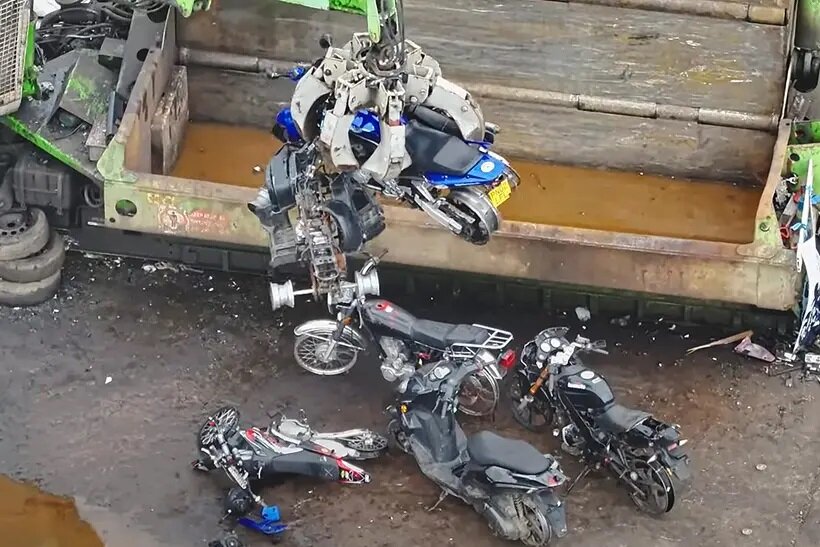Английские полицейские отчитались об уничтожение очередной партии мотоциклов и квадроциклов, который были использованы в преступных целях (воровство, грабежи) и антиобщественных действиях (громкий звук выхлопа, систематическое нарушение скоростного режима и т. д. и т. п. ). За уничтожением "мопедов" следил самый главный какой-то их констебль. Т. е. растащить на запчасти мопеды преступников не удалось) Сама же акция списания в утиль "здорово" техники, по мнению английских муса.... простите, полицейских, должна продемонстрировать всем байкерам-плохишам, что закон может быть и строг, но справедлив, и каждый нарушитель получит по заслугам, а вместе с ним и его "железный конь" попадет под "раздачу" )