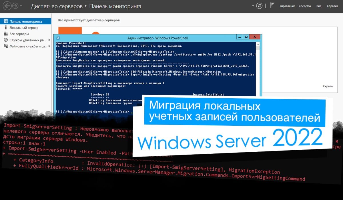 Столкнулся с необходимостью переноса локальных учетных записей пользователей при переезде на новый терминальный сервер. Переезд планировалось осуществить с помощью «средства миграции Windows Server» (ставится через "Управление –> Добавить роли и компоненты"). В лучших традициях продуктов от Microsoft с ходу эта затея не могла увенчаться успехом. Потому решил задокументировать правильный алгоритм действий, если у вас вдруг возникнет аналогичная задача миграции учетных записей пользователей на новый сервер. В моём случае переезд осуществлялся с Windows Server 2012R2 на Windows Server 2022, но всё написанное ниже актуально и для других версий серверов. Собственно, если просто установить средства миграции Windows Server через добавление ролей на исходном и целевом серверах, то при попытке импорта пользователей мы получаем проблему совместимости версий: Import-SmigServerSetting : Невозможно выполнить операцию миграции. Версии средств миграции сервера Windows исходного и целевого сервера от