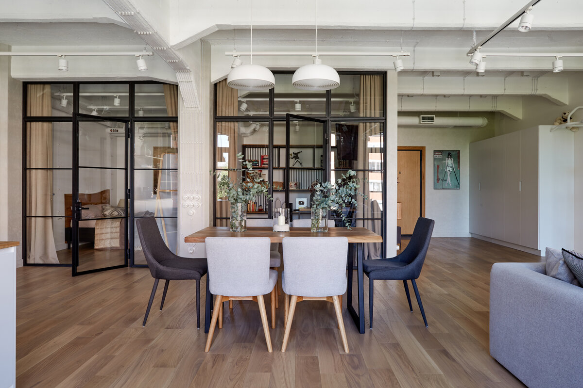 Основная задача, которая стояла перед нашей студией, — сохранить единое пространство кухни-гостиной с тремя окнами, а также выделить зоны гардеробной, спальни, кабинета и санузла. Мы разработали несколько вариантов планировочных решений, после чего получили желаемый результат. В кабинете и спальне одну из стен сделали прозрачной в виде стеклянной перегородки, благодаря которой в эти комна