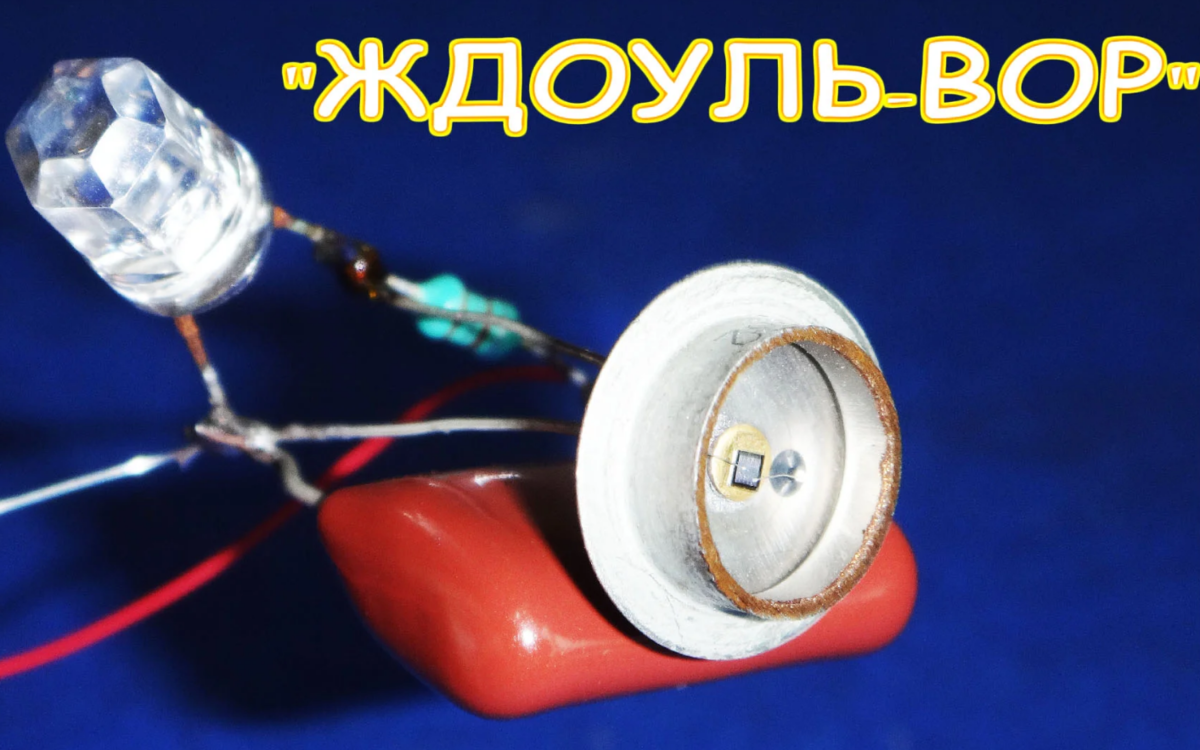 Схема миниатюрного повышающего преобразователя работающего от одной, даже севшей, пальчиковой батарейки и способного повысить напряжение настолько, что начинает ярко светиться белый светодиод, давно набила оскомину как начинающим радиолюбителям, так и лайхакерам разных сетей. Но ищущие умы не останавливаются и мы можем видеть весьма оригинальные вариации устройства имеющего целый ряд (букет) разных наименований. A joule thief is a minimalist self-oscillating voltage booster that is small, low-cost, and easy to build, typically used for driving small loads. This circuit is also known by other names such as blocking oscillator, joule ringer, or vampire torch. Так описывает устройство под названием "Joule thief" Wikipedia. Но что такое ЖДОУЛЬ-ВОР ? Обратите внимание на то, что в этом устройстве нет трансформатора который является неотъемлемой частью классической схемы "Joule thief" Похититель джоулей - это минималистский автоколебательный усилитель напряжения, небольшой, недорогой и про