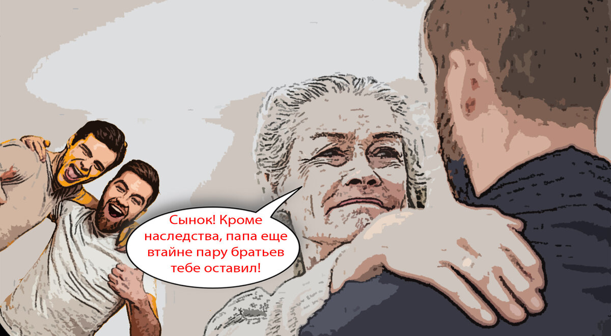 Появляются два молодчика добрых, одному 22 годика, второму 14 лет с маменькой наперевес и заявляются в наследство. От разных женщин. Друг о друге так же не знали.