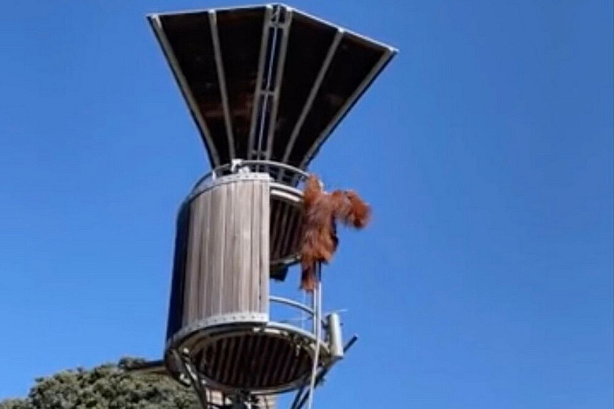 Избавившись от непрошеного гостя орангутан спокойно выпрыгнул из домика и продолжил карабкаться на вершину дерева.