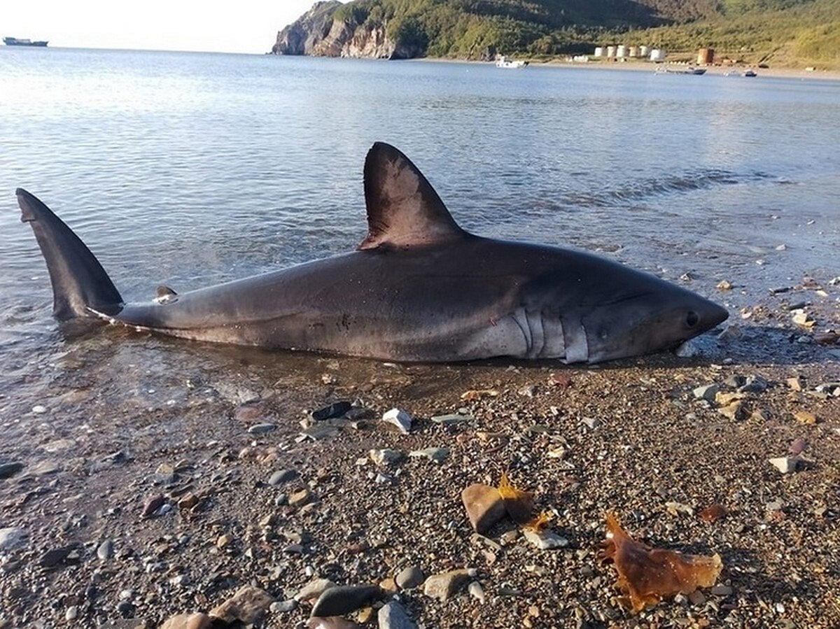 Жители Хабаровского края запечатлели на мелководье крупного хищника Жители Хабаровского края на берегу моря наткнулись на хищника: сельдевая акула находилась прямо на мелководье в бухте Аянской. Длина рыбы составляла около 3,7 метра, вес — примерно 230 килограмм.