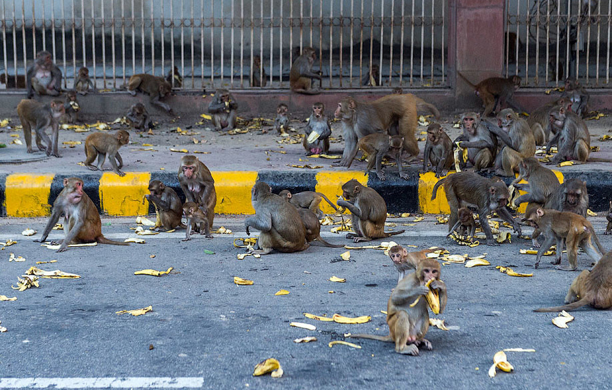 А чтобы отпугнуть тысячи маленьких обезьян, которые обитают возле правительственных учреждений и крадут еду у пешеходов, на тротуарах города установили фигуры в виде обезьян другого, более крупного вида — чернолицых лангуров — в натуральную величину.