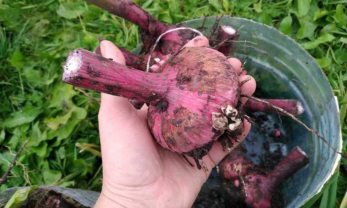 Затем промывают в воде, опускают в раствор карбофоса, концентрацию которого следует сделать вдвое выше, чем указано в инструкции. Через 15 минут растения вынимают и опускают прямо в чулках в раствор марганцовокислого калия ярко-розового цвета (на 15 минут). После этого вынимают из чулка, срезают надземную часть, оставив пенёк примерно в 4-6 см, и раскладывают в сухом помещении. Сушка идёт около 20 дней при температуре примерно 22-25°С. Затем корни вместе со старой луковицей легко отделяются от новой луковицы. С неё следует снять все чешуйки.