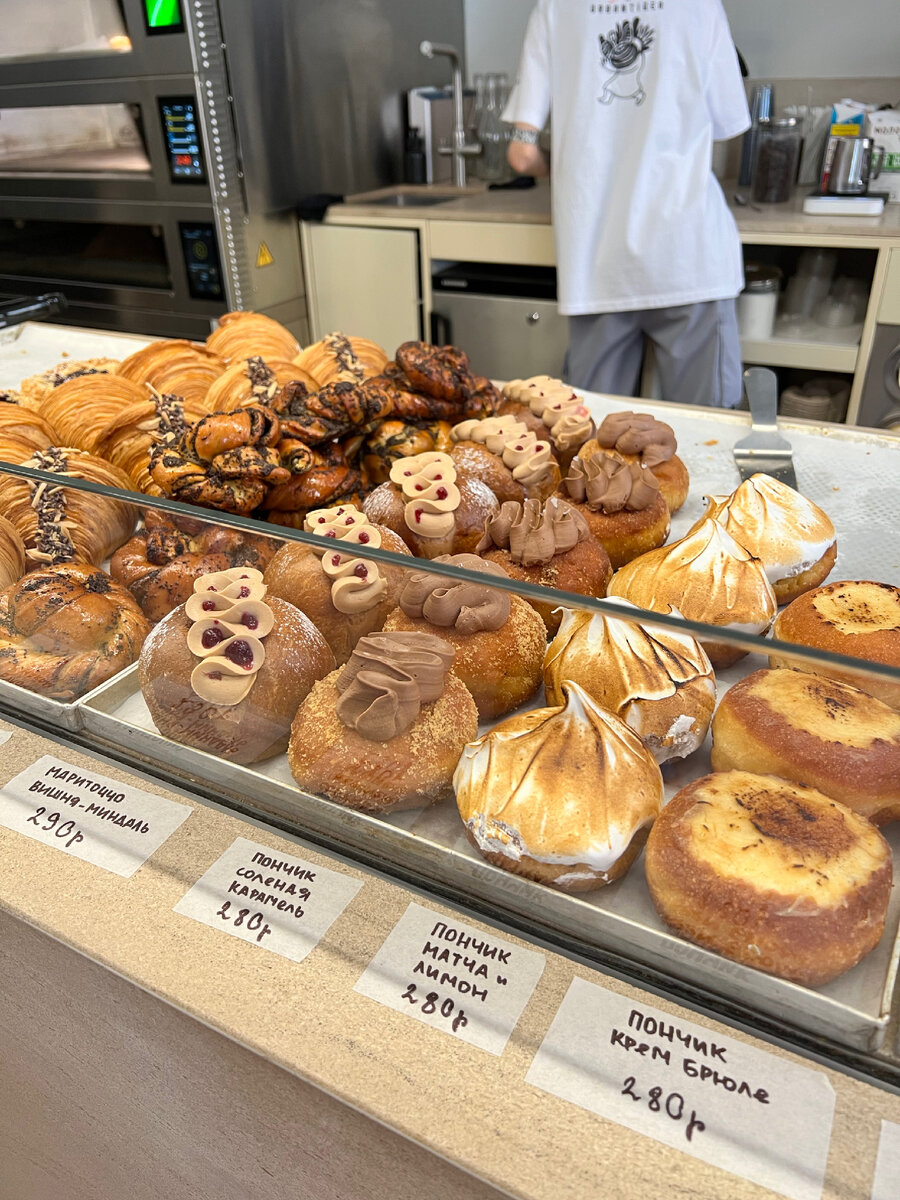 На одной-двух булках наш выбор остановиться не смог. Мы взяли с собой: пончик соленая карамель, булочку с маком, ягодную ватрушку, флан паризьен. На месте мы заказали пончик крем брюле, маритоццо вишня-миндаль, сосиску в тесте, зеленый чай и какао. Общий чек вышел на 2 410 руб.