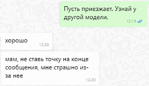 Решила вам поделиться одним наблюдением, которое родилось неожиданно, в разговоре с дочкой. Аня поделилась как-то интересным отношением к точкам. Сказала, что сейчас у них, у молодого поколения, есть тенденция не ставить в конце предложения точку — так получается более деликатный письменный разговор. А недавно в переписке со мной написала вот что: То есть, получается, у детей сейчас будто две параллельных вселенных: в одной, в школе, они ставят точки, иначе им снизят оценки; а в другой, вне стен учебного заведения — нет. Точка в музыке и секте Еще до того первого разговора с дочкой я услышала в одном из интервью с одним известным молодым исполнителем такую интересную вещь, что сейчас у молодежи вызвать эмоцию можно, если написать музыку так, как будто после каждого слова в песне ты ставишь точку. И в качестве примера был назван Моргенштерн (включен в список иноагентов), который на время того интервью был дико популярен у школьников: по сложности музыка достаточно проста, не особо внятн