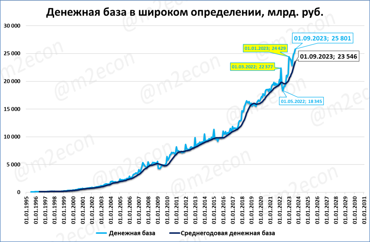 ЦБ опубликовал статистику денежной базы в широком определении (далее – денежная база или ДБ). На 1 сентября она выросла до 25,8 трлн рублей – это абсолютный рекорд.