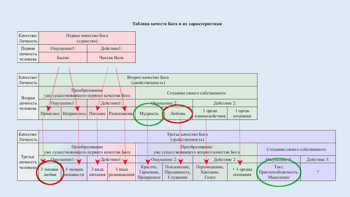 Вышеуказанная таблица сразу же демонстрирует наблюдательному читателю тот же самый скрытый подвох. Во-первых, существует любовь (ощущение), которая является уникальным детищем второго качества Бога. Во-вторых, существует ещё одна любовь, которая появилась путём следующих длительных модификаций. Сначала ощущение чистого бытия (первое качество Бога) было преобразовано вторым качеством Бога в ощущение приятного и неприятного. Затем уже приятное ощущение было ещё раз преобразовано (третьим качеством Бога) в эмоцию любви. Таким образом, налицо два базовых вида любви, имеющих очень разную природу своего происхождения в человеке.