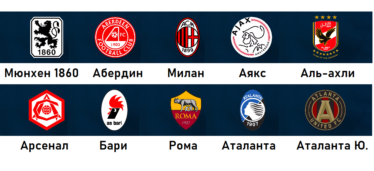 📒 Открывает рейтинг герб команды «Мюнхен 1860». Согласитесь, что эмблемой это сложно назвать. Такое изображение отлично будет смотреться на рыцарском щите. Также в первой пятерке представлены «Абердин», «Милан», «Аякс», а также «Аль-Ахли». Да-да, саудовские клубы врываются не только в список самых затратных команд на трансферном рынке.
