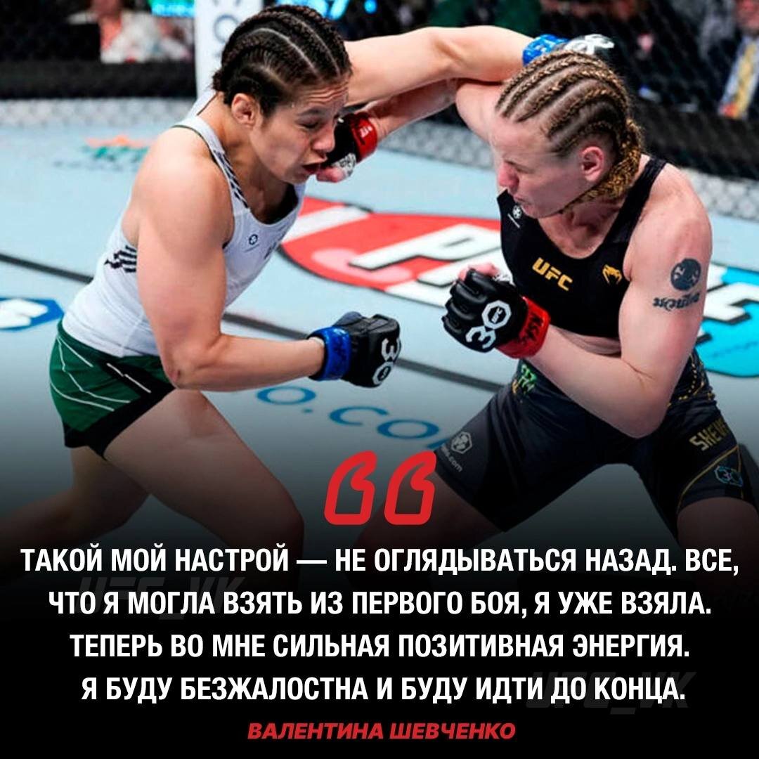 «Прямо сейчас я тот человек, который мотивирован избавиться от этого «мартовского чувства». Я твердо знаю, что буду делать в это воскресенье. Такой мой настрой — не оглядываться назад. Все, что я могла взять из первого боя, я уже взяла. Теперь во мне сильная позитивная энергия. Я буду безжалостна и буду идти до конца. У меня сейчас нет выбора — никаких сантиментов. Нет времени на это. Мне предстоит бой. Я должна идти вперед, не делая ни шагу назад», — приводит слова Шевченко MMA Junkie.