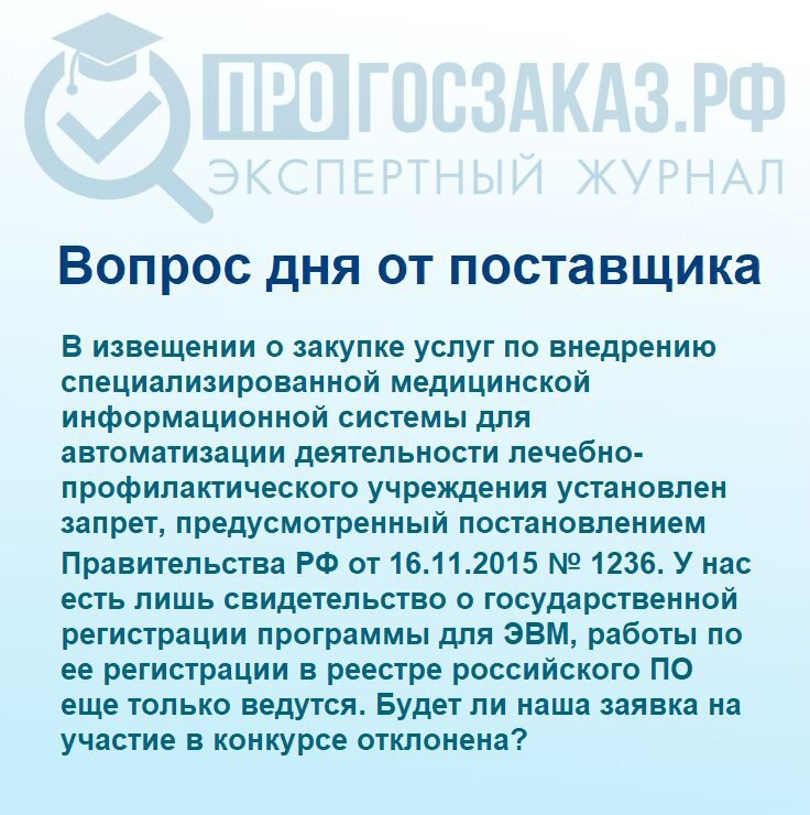 В извещении о закупке услуг по внедрению специализированной медицинской информационной системы для автоматизации деятельности лечебно-профилактического учреждения установлен запрет, предусмотренный постановлением Правительства РФ от 16.11.2015 № 1236. У нас есть лишь свидетельство о государственной регистрации программы для ЭВМ, работы по ее регистрации в реестре российского ПО еще только ведутся. Будет ли наша заявка на участие в конкурсе отклонена?
