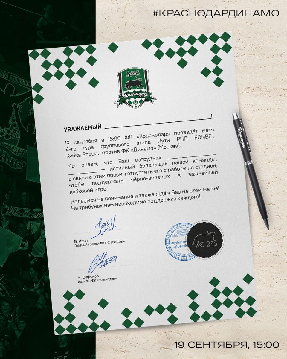 Как стало известно 15 сентября, ФК «Краснодар» попросил работодателей отпустить своих сотрудников на матч «быков» с московским «Динамо». И даже подготовил официальное письмо обращение для болельщиков, которое они могут скачать и принести своему начальству. "Не пришел на работу, потому что болел. Болел на стадионе за любимый клуб! Лучшие в мире руководители всегда отпускают своих сотрудников на футбол. Просто скажите ему об этом перед матчем 19 сентября. А если не поможет, то предлагаем вам передать начальству наше официальное письмо-приглашение на игру. Нам очень нужна поддержка каждого из вас! До встречи на стадионе, «быки»!, - говорится в тг-канале ФК «Краснодар». Фото: тг-канал ФК "Краснодар" Здесь и образец заявления скачать предлагается. Которое, кстати, подписано главным тренером клуба Владимиром Ивичем и капитаном команды Матвеем Сафоновым. "19 сентября в 15:00 ФК «Краснодар» проведет матч 4-го тура группового этапа Пути РПЛ FONBET Кубка России против ФК «Динамо» (Москва). Мы зн