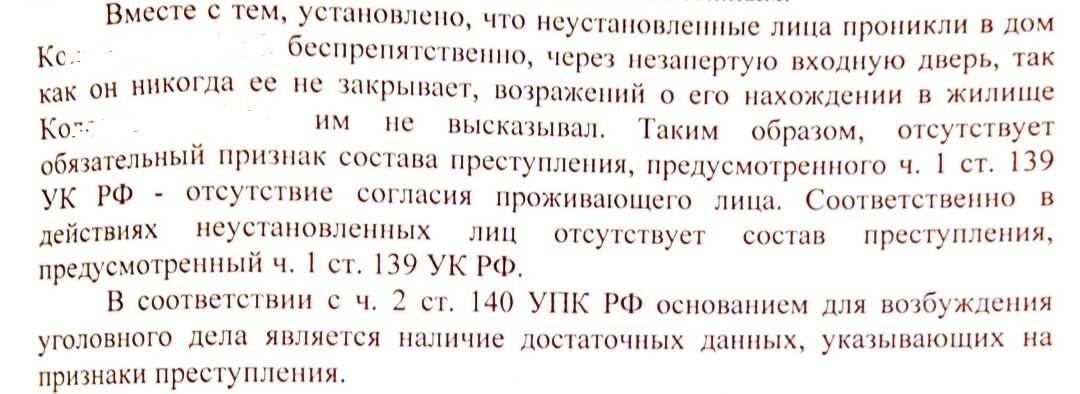 В октябре 2021 г. трое неизвестных мужчин ворвались в дом гражданина К. и начали избивать его. Били кулаками, ногами и булыжником. К. утверждает что его хотели убить. В конфликт вмешался сын К. который случайно оказался дома и мужчины сразу сбежали. Следственным комитетом Индустриального района г. Ижевска возбуждении дела отказано по очень "убедительным" основаниям.