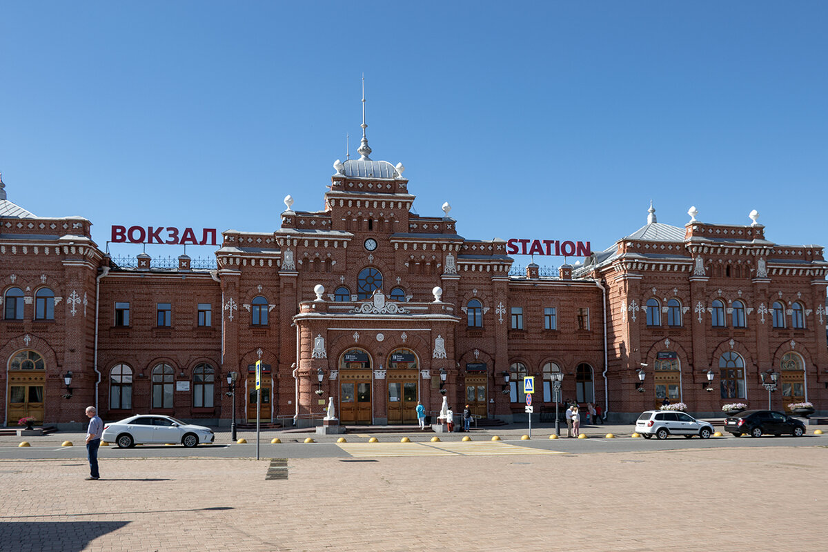 Мы приехали в Казань на поезде утром 3 сентября, а посадка на теплоход начиналась вечером этого дня. Мы специально так запланировали, чтобы можно было погулять по столице Татарстана. Историческое здание казанского железнодорожного вокзала было построено в 1893 году. А через 99 лет оно сгорело, но к столетней годовщине в 1993 году было полностью восстановлено. Казань – один из крупнейших городов Российской Федерации. По численности населения (около 1,3 млн человек) он уступает только двум столицам России и городам Новосибирску и Екатеринбургу. Для полного знакомства с таким городом требуется не один день. Прошлый раз мы были в Казани два года назад. Во время автобусно-пешеходной экскурсии нам тогда показали основные исторические места города, а подробно мы успели осмотреть только кремль и мечеть Кул-Шариф. В этот раз мы решили пройти пешком всю улицу Баумана, выйти на Кремлевскую набережную и еще раз пройтись по Казанскому кремлю. Свою прогулку мы начали с площади Тукая. К этой площади