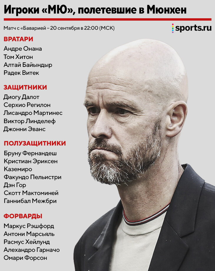 Боль «МЮ» – это не только результаты на старте сезона. Ситуацию заметно усложняют проблемы с недоступностью игроков. В Мюнхен на матч с «Баварией» летит максимально усеченный состав. Голкиперов в нем больше, чем центральных защитников. Ситуация с отсутствующими игроками просто катастрофическая. Если у центрдефов есть сомнительная подстраховка в виде Эванса, то прикрывать Далота и Регилона (который сам стал экстренной мерой) просто некому. ● Единственная шалость в нашем составе – Тирелл Маласиа в воротах. Хотя еще недавно там был Том Хитон, только-только залечивший травму. ● Софьян Амрабат во вторник тренировался индивидуально, Маунт и Варан – вместе с командой. В Германию не полетел ни один – очевидно, это мера предосторожности для исключения риска рецидива. ● За день до игры травмировался Харри Магуайр. «У него были некоторые жалобы, нам нужно посмотреть, насколько все плохо. Он закончил тренировку, но не был готов к поездке», – объяснил ЭТХ на пресс-конференции. За день до Магуайра