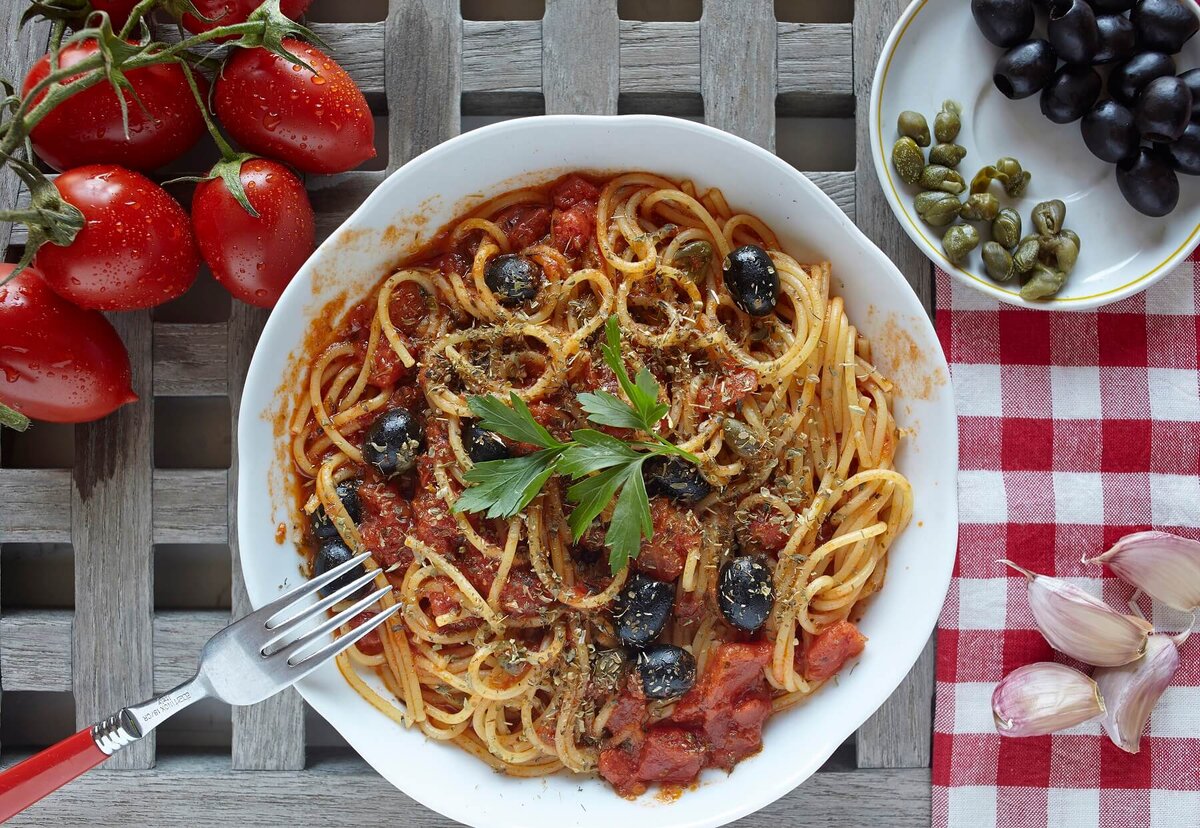 Спагетти с ндуджой, фенхелем и оливками на одной сковороде