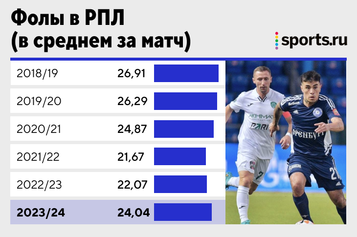 С сезона-2018/19 количество зафиксированных фолов поступательно снижалось. Минимального значения достигли в сезоне-2021/22 – тогда команды РПЛ фолили в среднем 21,67 раза. В прошлом чемпионате количество нарушений незначительно выросло, а в нынешнем сезоне судьи в среднем фиксируют на два нарушения больше.