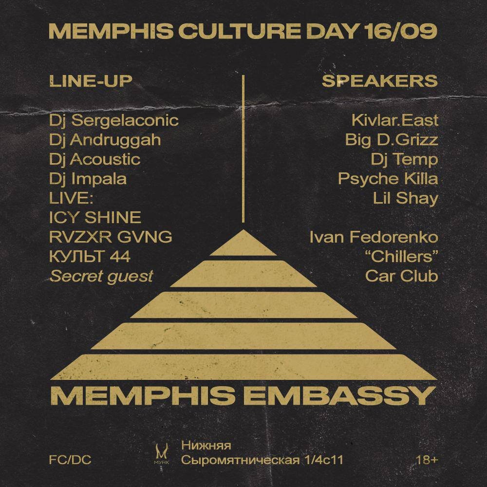 слушать мемфисский Кранк и Ганста-рэпа и танцевать Jookin / Gangsta walkin. Также в программе заявлена образовательная часть в формате «Public talk», спикерами которой выступят настоящие профи. Kivlar East – амбассадор Memphis Jookin в России. Человек, который стоит за всеми проектами Memphis Jookin Russia. Больше 15 лет занимается развитием Мемфисской культуры в России и за это время успел поработать с многими знаковыми артистами из Мемфиса (Tommy Wright III, DJ Zirk, Romeo from G-Style). Big D.Grizz – основатель стрит-лейбла MSE, студии звукозаписи MoneyS