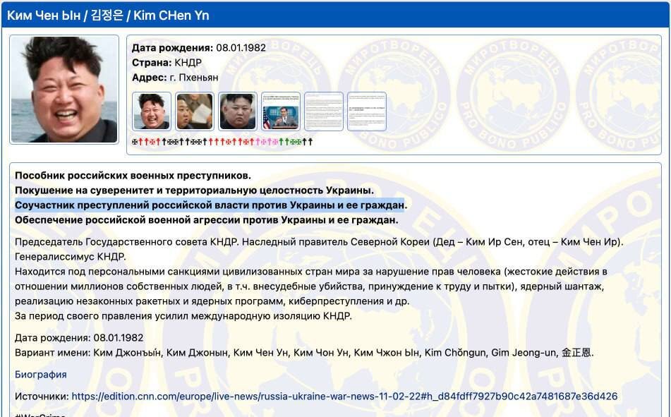 Я долго смеялась (правда, смех был с привкусом горечи): Ким Чен Ын попал на «Миротворец». Ниже - цитаты с сайта: Соучастник преступлений российской власти против Украины и ее граждан. Вопрос: ну ладно вы русских с грязью смешали. А Ким-то В ЧЕМ КОНКРЕТНО замешал в отношении Украины? Визит Кима на Дальний Восток - это что, соучастие в действиях против Украины? Каких преступлений? Где факты-то? Находится под персональными санкциями цивилизованных стран мира… Каких "цивилизованных стран мира"? Ну кроме Штатов, конечно. Персональные санкции против Кима в 2016 году ввели США. А какие ещё «цивилизованные» страны? Или больше «цивилизованных стран мира» в мире нет? А теперь - самое интересное. За что же «цивилизованные страны мира» наложили персональные санкции на Кима. На «Миротворце» это всё перечислено, что самое удивительное. ...жестокие действия в отношении миллионов собственных людей... Да-да, не падайте ни со стула, ни с кровати. Это пишут товарищи с Украины. Той самой, которая регул