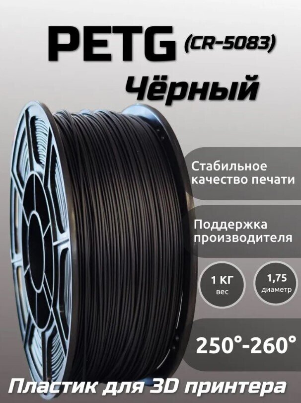 На днях приехала на пробу катушка не совсем обычного PETG от производителя МАКО, которого я недавно для себя открыл. Необычность заключается в составе, а точнее в пониженном содержании в нем гликоля, за который отвечает буква G в названии пластика. Таким образом, теперь его буду писать так: “PETg”. В теории, изменение должно отразиться на печати как в худшую сторону, так и в лучшую. В худшую - требование более высокой температуры сопла и стола, а значит, к принтеру и печатнику возможны вопросы. В лучшую - повышение твердости и температуры размягчения, чего иногда не хватает “обычному” PETG с большой “G”. Официально название состава CR-5083. На страничке OZONа, где я его заказал, выглядел так: В реальности катушка оказалась даже лучше намотана, чем на рекламной фотографии. Обычно, я печатаю этого вида материалом при температуре сопла 235-240℃ и стола 80℃, для новенького же поставил сразу 250℃. Про стол забыл, но он мне напомнил о себе практически сразу, заготовка отвалилась на первых же