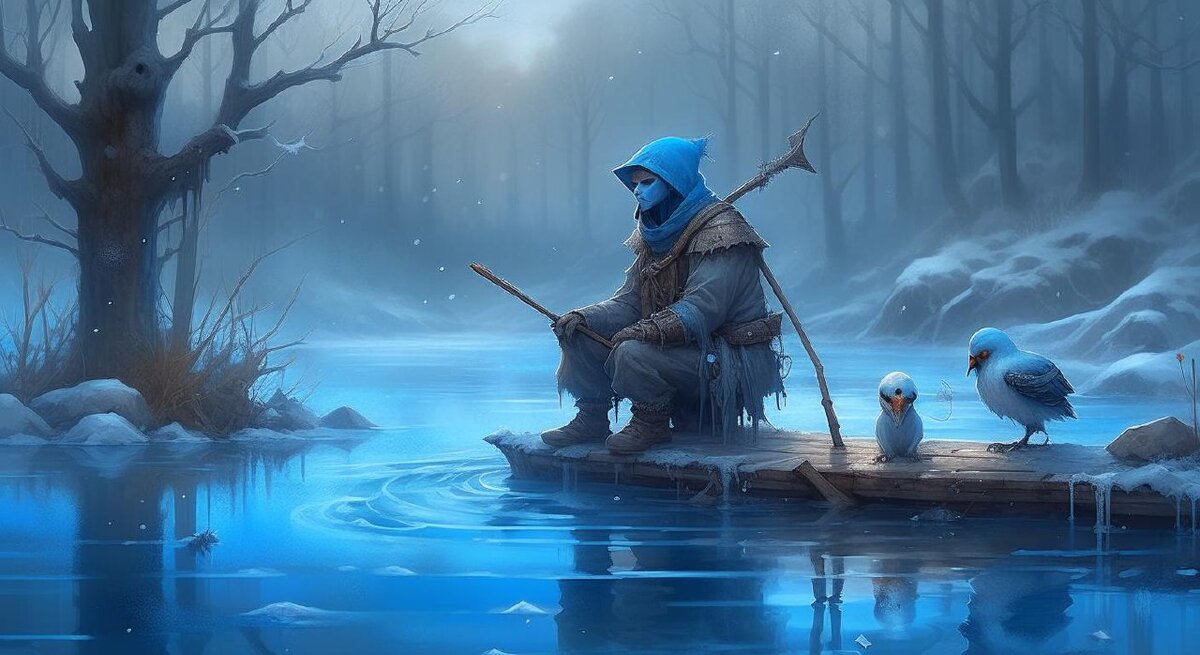 В центре реки над прорубью сидел пожилой мужчина в большом коричневом тулупе, шапке-ушанке, рукавицах и больших валенках. В руках он держал удочку. Вокруг него на льду лежали разные спиннинги, сачки, крючки, даже гарпуны. Такое впечатление, что он в этой реке ожидал поймать любую рыбу вплоть до акул и китов.