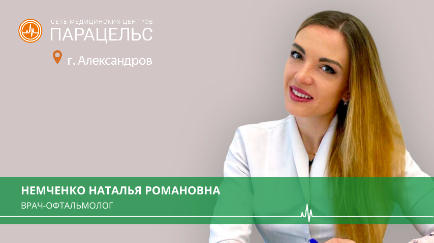 Знакомим вас с нашим офтальмологом Немченко Натальей Романовной. Ведёт приём взрослых и детей с 0 лет в клинике "Парацельс" в городе Александров. Лечит и диагностирует следующие заболевания: Профессиональные компетенции Первый день приёма у Натальи Романовны – 1 октября.