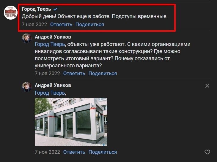 И всё это про ситуацию с новыми современными павильонами на бульваре Ногина. Уже больше года Администрация города Твери игнорирует ошибки на данном объекте, а сейчас и вообще утверждает, что все вокруг неправы. Конечно, сейчас речь идёт о доступности этих самых павильонов – современного общественного пространства, как пишет Администрация. Но смотря на реальность происходящего, хочется ответить следующим образом: слова новое, современное и общественное равно доступное. И никак по-другому. Но, как мы видим по фото и видео, про доступность только говорят… Администрация города Твери откройте глаза и перестаньте обманывать!!! Конечно, практика обещать – не значит сделать широко распространена, но давайте попробуем по-другому. Когда речь идёт о людях, которым необходимы дополнительные условия для деятельности – послушайте, проанализируйте, примите и сделайте. И будете правы. Можем провести эксперимент: получится ли у Администрации Твери беспрепятственно попасть во внутрь торговых павильонов