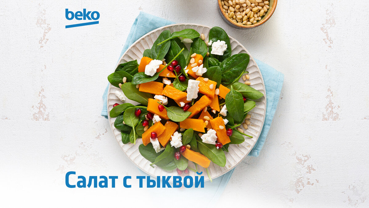 Сезон тыквы - время, когда этот оранжевый овощ становится настоящей звездой. Она идеально сочетается с цветами опадающей листвы и добавляет осеннюю атмосферу в вашу кухню. Как вам идея приготовить из тыквы супер полезный и вкусный салат, который готовится всего за 25 минут? Охотно делимся рецептом! В Европе тыкву используют для супов, запеканок, пюре и салатов, существует даже тыквенный кофе. Армяне фаршируют тыкву рисом или кизилом с орехами и добавляют её в плов. В Индии готовят великолепную халву из этого овоща. А мы с вами приготовим салат, чтобы не упустить возможность насладиться свежей тыквой. 1. Разогрейте до 220 градусов духовой шкаф Beko BBIS12300XDE. Тыкву нарежьте на кубики со стороной 3 см, смешайте с маслом, солью, перцем и выложите на противень. Поставьте запекаться на 20 минут. Выньте из духовки, переверните и запекайте еще 7-10 минут. Снова выньте и дайте остыть до комнатной температуры. 2. Смешайте все ингредиенты заправки, лучше в банке, закройте и хорошо встряхните