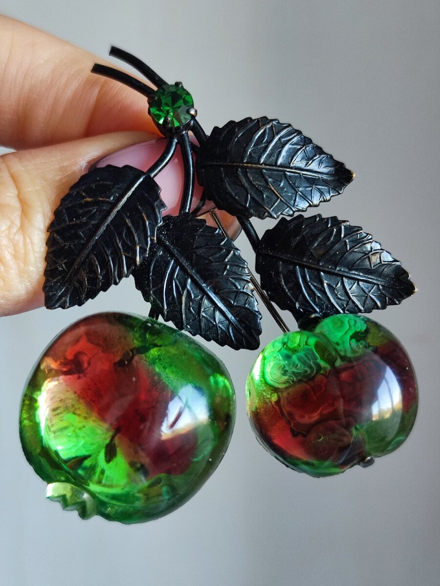 Австрийская серия брошей фруктов заставила не одно женское сердце биться быстрее. И удивляться здесь нечему, украшения действительно бесподобно прекрасны. Они создавались в разных размерах: большие и маленькие. Однако самые крупные броши из серии Австрийские фрукты совсем не такие, какими их представляют. Они гигантского размера! Покажу на примере с линейкой. 1 Первая встреча с огромной Австрийской брошью Однажды в продаже увидела Австрийскую брошечку и удивилась, что она по стоимости дороже, чем все другие. При этом купили ее очень быстро. Об этой истории забыла, пока сама не увидела подобный экземпляр вживую и тут все поняла! Брошь была не просто крупной, как основная серия брошей, а скажем так, гигантской! Фото для примера (снимок той, что лицезрела впервые, уже не найти) Оттого и цена была соответствующей. 1 Броши с одиночным крупным кабошоном Если вы решили, что покажу вам брошь с крупной литой вставкой, как на третьем фото, то вы ошибаетесь. Да, сама ягодка у этой желто-оранжевой