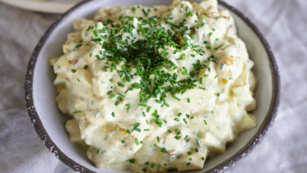 Яичный салат с беконом, яблоком и заправкой карри, простой рецепт, быстрое приготовление