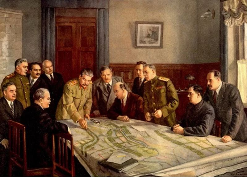 Холст изображал заседание Политбюро ЦК ВКП(б). С этой картиной, правда, вышла некоторая неувязка, однако не по вине художника. На версии 1949 года в центре мы видим склонившегося за столом Политбюро и задумавшегося о чём-то Лаврентия Павловича Берию. Но к июню 1953 году Лаврентий Павлович оказался... В итоге родился второй вариант произведения, на котором стул Лаврентия Павловича внезапно опустел. Для счастья народа. 1953
