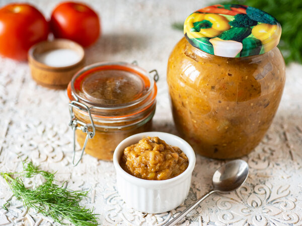 Овощная аджика получается пикантной и очень вкусной. Она отлично подходит к любому мясу или рыбе. Аджика великолепно хранится целую зиму в обычной кладовке и без всякой стерилизации. Главное, хорошо промойте и простерилизуйте баночки перед закладкой аджики😉 Аджика из кабачков и баклажанов на зиму Из указанного количества ингредиентов получается 1 л аджики. 📝ПРИГОТОВЛЕНИЕ: 1. Первым делом подготовим все овощи. Все перцы (болгарский и острый) помойте и очистите от семян. С кабачков удалите кожицу и при необходимости семена (если кабачки переросшие). С помидоров удобным вам способом снимите кожицу. Обжарьте на сковороде с маслом нарезанный лук с тёртой морковью. Затем положите нарезанные кубиками баклажаны и кабачки. Далее добавьте порезанный перец и помидоры. Тушите овощи под крышкой, периодически перемешивая, до готовности. Огонь - небольшой, а ориентировочное время приготовления - 40 минут. 2. Измельчите овощи погружным блендером, так чтобы были крупинки овощей, а не полностью одноро