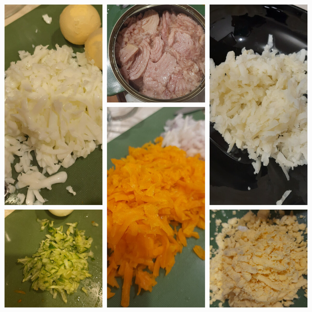 Люблю салат мимоза, но ... Нужно покрутить повертеть,и вот что накрутила. ●картошка ( у меня одна большая) ●морковь ( у меня две элегантные ) ●яйки ( у меня три 😁 ) Всех выше перечисленных варим и чистим и трём поодиночке. ○баночка тунца ( кусочками в собственном соку ), его топчим ○луковица ( среднестатистическая ) её в мелкую крошим ○огурчик ( стыдливо маленький )его трём □мазик ( клей для поделки ) •тертая варёная картошка •клей ( майонез ) •мелко нарезанный лук ☆тунец размятый •клей 😁 •морковь •немного лука ( если остался ) •огурка •клей ( мазик ) •белок натертый •клей •желток натертый Нужно дать постоять в холодильнике от часа можно чуть дольше. Берём ложку столовую и употребляет. Все выше перечисленное на одного взрослого или двух детей, в один присест.( мне подходит по количеству детей )