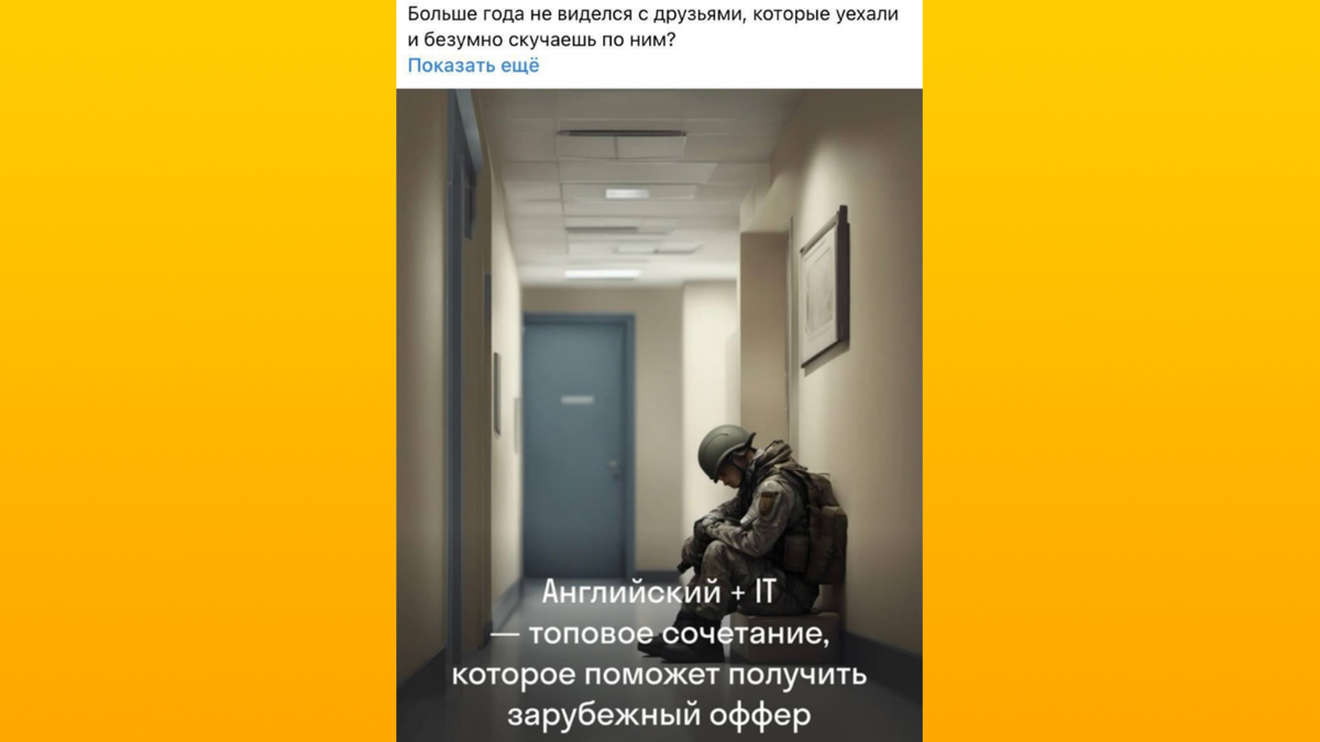 Онлайн-школа Skyeng принесла извинения за рекламу, где был изображен грустный мужчина в военной форме с подписью: «Больше года не виделся с друзьями, которые уехали, и безумно скучаешь по ним? Английский + IT — топовое сочетание, которое поможет получить зарубежный оффер». На рекламу обратил внимание глава комитета Госдумы по информполитике Александр Хинштейн, пишет РБК.