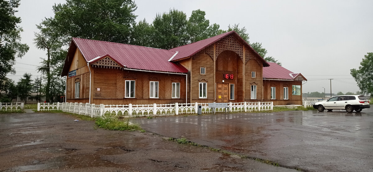В последний день нашего путешествия к Татарскому проливу шёл сильный дождь. Мы полностью вымокли, ища крабов и раков на пляже. И такими отправились на железнодорожную станцию, чтобы вернуться в Хабаровск. Железнодорожная станция Советская Гавань - Сортировочная находится в посёлке Октябрьский и является последней пассажирской станцией всего БАМа. Дальше, в саму Советскую Гавань идут только грузовые поезда. От пляжа до Октябрьского мы добрались на такси. Закупились в местном магазине и отправились на станцию. У здания вокзала очень интересная архитектура. Ведь его строили японские военнопленные. Снаружи здание деревянное, а внутри каменное. Дождавшись отправления поезда мы запрыгнули в вагон, укутались в одеяла и заказали у проводницы чай. Естественно в фирменной подставке РЖД. Дождь и лил так за окном ещё все следующие сутки, пока мы тряслись в вагоне мчась по восточному БАМу. Мы проехали вдоль пролива, рек и озёр. Пересекли Сихотэ-Алинь и дважды Амур, прежде чем добраться до мес