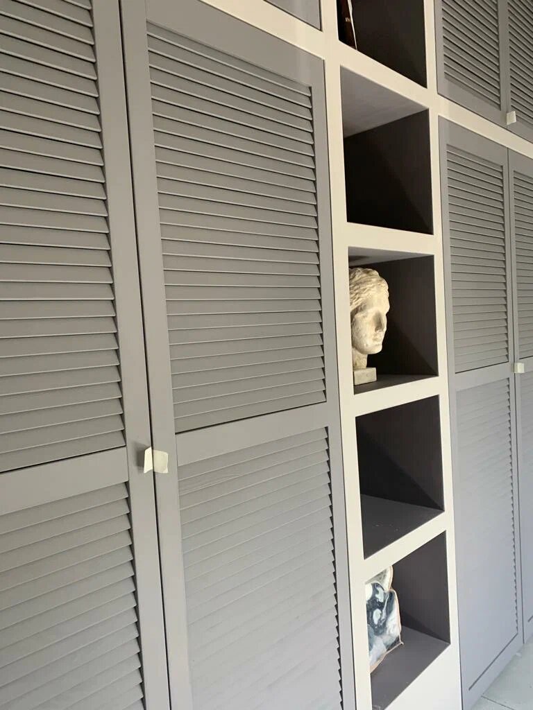 Эстетический вид: Жалюзийные двери придают шкафу элегантный и современный вид. Добавляет шкафу легкости и привлекательности. Оптимизация пространства: При закрытых жалюзийных дверях шкаф выглядит компактно и аккуратно. Они позволяют использовать полезное пространство шкафа максимально эффективно Регулируемая вентиляция: Жалюзийные двери имеют ламели, через них происходит вентиляция внутри шкафа. Это особенно полезно для хранения предметов, которым требуется циркуляция воздуха, таких как обувь или текстильные изделия. Легкость использования: Открывание и закрывание жалюзийных дверей происходит плавно и без усилий. Разнообразие материалов и отделки: Жалюзийные двери доступны в широком ассортименте материалов и отделок, что позволяет выбрать оптимальное решение, соответствующее вашему интерьеру.