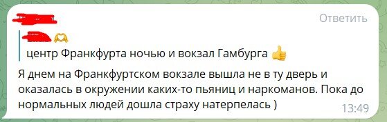 Продолжаю читать разные чаты русскоязычных в Германии. Это интересно по многим причинам. Во-первых, узнавать про страну надо не из телевизора и уж тем более не того телевизора, что сейчас, а от людей, которые там живут. Во-вторых, всякие тонкости только из таких чатов и услышишь. И вот, в одном из них подняли тему безопасности в стране. Есть ведь, с одной стороны, миф, что Германия супер безопасная, а с другой, ТВ нам рассказывает как там все разваливается и гниет. А что же по факту? А по факту бывает разное. В основной своей массе люди пишут, что жить там действительно не так страшно, как в России, но бывает и обратная сторона. Так что иллюзий не строю. Вот несколько сообщений из того самого чата.
