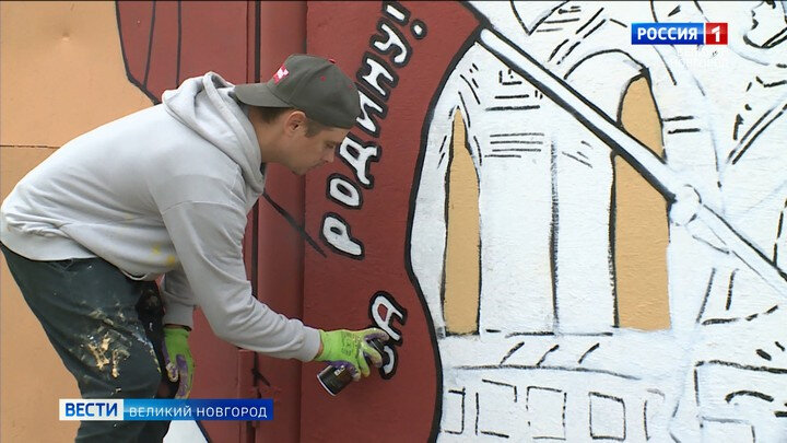 В Великом Новгороде на улице Парковой в эти дни создается новый арт объект. Написать граффити, посвященное предстоящему Дню зарождения Российской государственности на длинной стене гаражного комплекса, Антону Макушину предложили в городском комитете культуры. Уличный художник идею поддержал, тем более что его муралы уже можно встретить на фасадах многих новгородских домов. Он сделал эскиз из пяти тематических направлений, отражающих историю и культуру областного центра. Они посвящены новгородским университету и музею, русской православной церкви, зарождению российской государственности и подвигам, совершенным нашими земляками. Работа над большим муралом продолжается - граффити будет готово именно ко Дню зарождения Российской государственности, который отмечается 21 сентября.