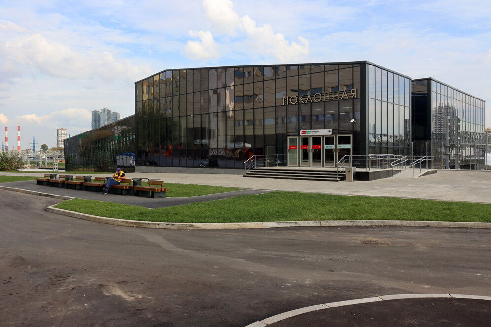 1. Ближайший к метро «Парк Победы» вход на новый остановочный пункт, заменивший собой одноимённый, располагавшийся западнее, находится рядом со зданием Центра специального назначения по обеспечению безопасности дорожного движения МВД России в ста метрах южнее Поклонной улицы. От метро спокойным шагом выходит где-то 10 минут. Поближе, чем к старой.