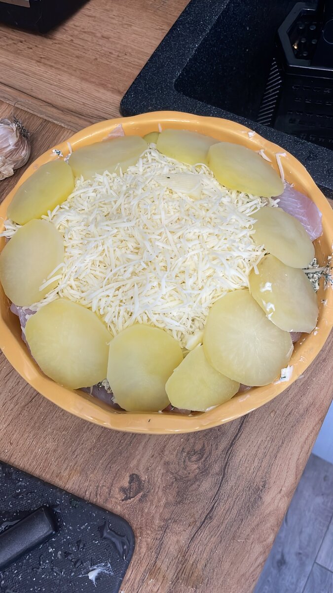 Остывший картофель режем кружочками, не толстыми и укладываем в круглую форму(одну картофелину оставим для верхнего яруса). Укладываем филе рыбы , сверху выкладываем смесь из сыра, сверху посыпаем тертым сыром. И выкладываем кружочки картофеля по кругу оставляя серединку открытой. Отправляем в разогретую до 180гр. Духовку на 30 мин.
