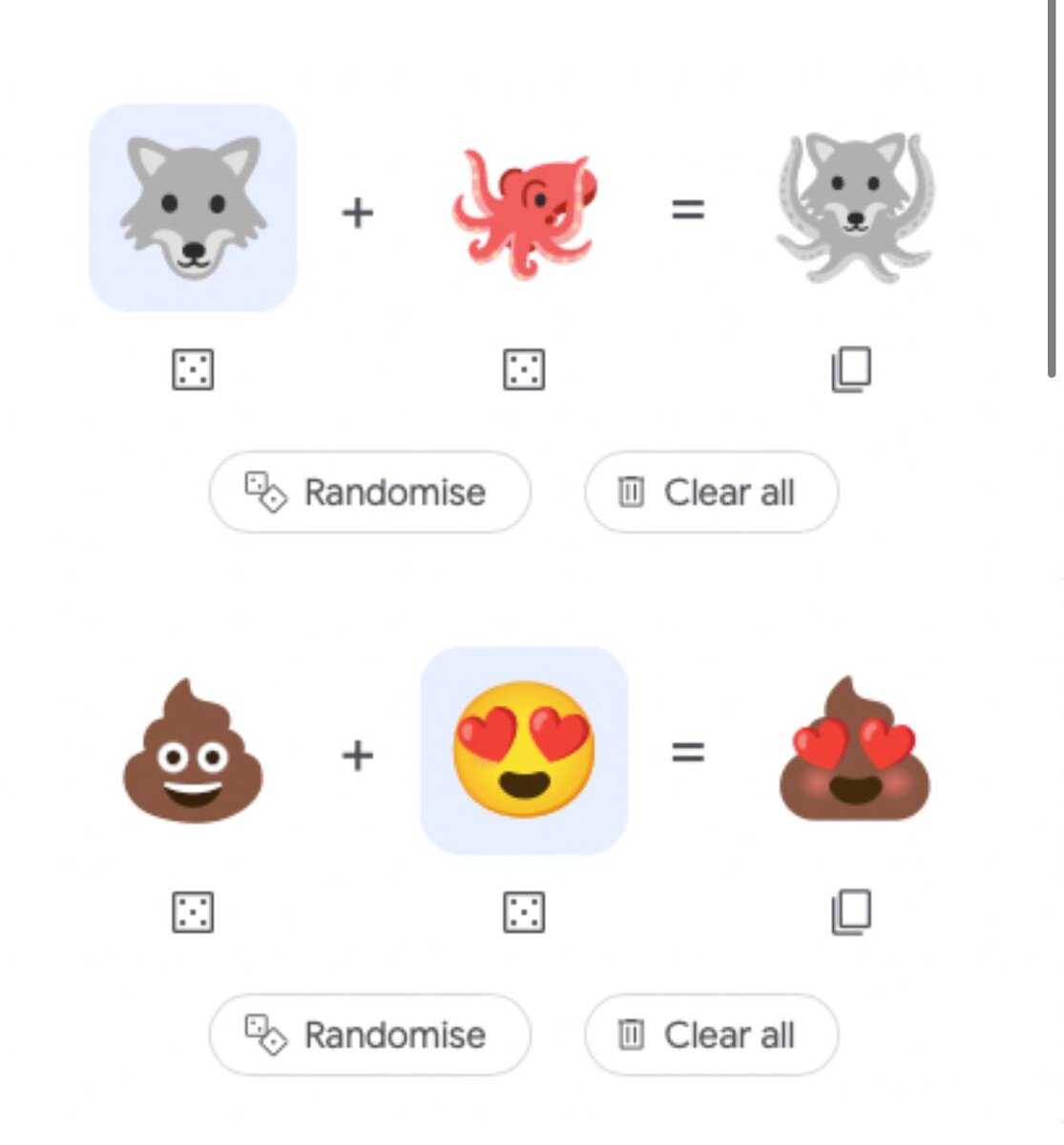 Смысл сервиса прост до безобразия: загружаете два любых эмоджи в комбинатор и получаете на выходе что-то среднее. Количество вариаций поражает воображение, и даже страшно представить, сколько ушло времени на отрисовку. Ну или за художников постаралась нейросеть. Создать волкосьминога или влюблённую какашку можно прямо через строку поиска, вбив «emoji kitchen». Предупреждаем: это затягивает и можно залипнуть надолго. Хотелось бы потом увидеть такую функцию прямо в клавиатуре, а то, бывает, не можешь определиться: оппонент – козёл или олень? А тут сразу два в одном.